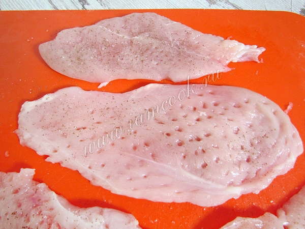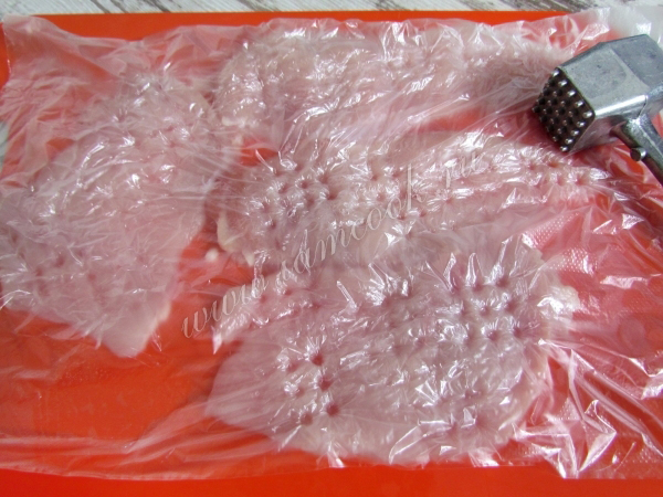 Накройте филе пищевой пленкой и отбейте с двух сторон.
