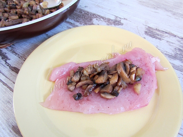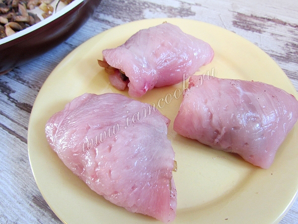 Положите немного грибной начинки с луком на каждую куриную отбивную.