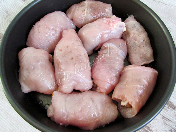 Смажьте форму для запекания растительным маслом и положите в нее куриные рулетики швом вниз.