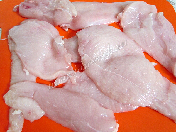 Куриное филе промойте под холодной водой, обсушите, каждое разрежьте вдоль на несколько частей.