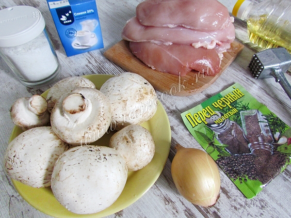 Для приготовления куриных рулетиков с грибами подготовьте необходимые продукты.