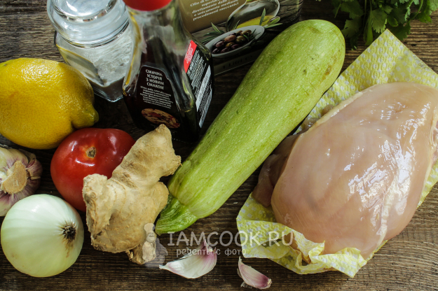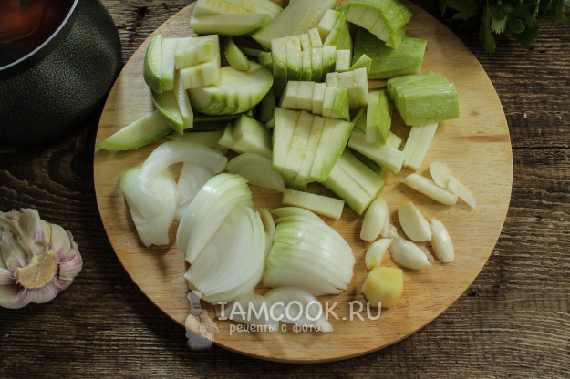 Брусками примерно одного размера нарежьте кабачок, нашинкуйте крупно лук, чеснок, снимите оболочку с фрагмента корня имбиря. Ошпарьте помидор и стяните кожицу.