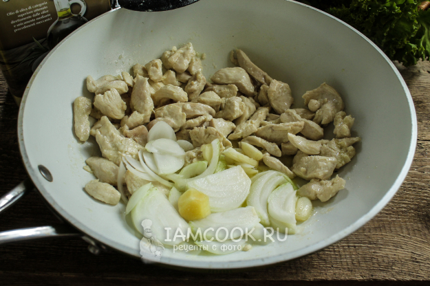 К побелевшему мясу загрузите лук, чеснок, имбирь. Встряхните и продолжайте жарку еще минуты 3.
