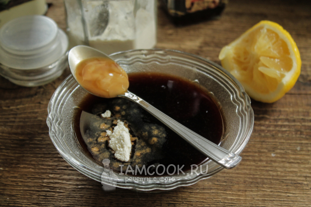 Одновременно в холодном соевом соусе разведите лимонный сок, мёд и крахмал.