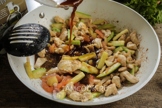 Залейте курицу с кабачками крахмальным соевым соусом. Мешайте, позвольте закипеть/завариться соусу и сразу снимайте с огня. Перец, другие специи — по вашему вкусу и желанию.