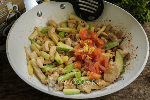Теперь очередь измельченного томата и лимонной цедры. Дайте протомиться пару минут.