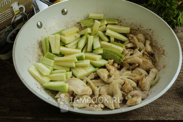 Затем — кабачки, перемешайте. Держите на огне 3-5 минут.