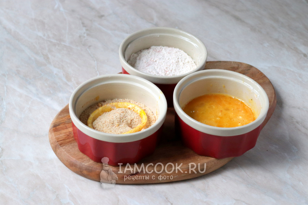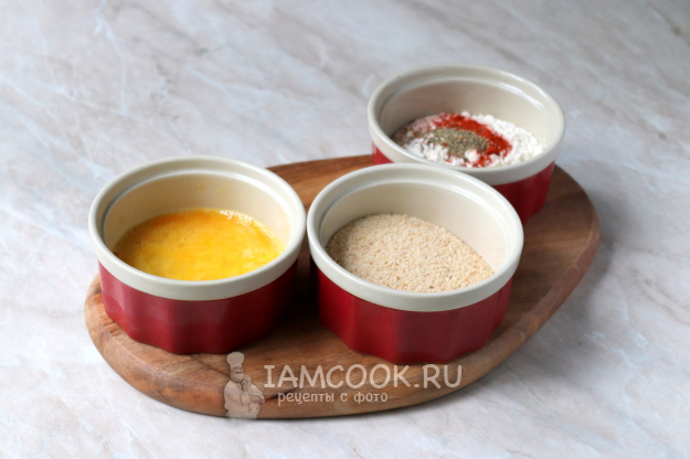 Тем временем подготовьте три ёмкости. В одну вбейте куриные яйца, добавьте щепотку соли и тщательно перемешайте до однородного состояния. Во вторую насыпьте панировочные сухари, а в третьей соедините пшеничную муку, немного соли, чёрный молотый перец и сладкую молотую паприку. По желанию список специй можно менять, используя те, которые вам больше нравятся или есть в наличии.