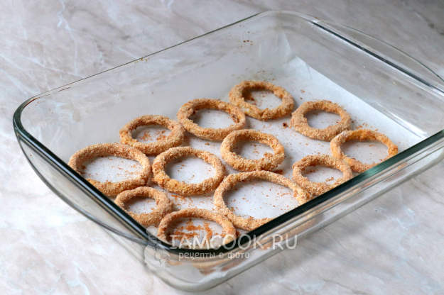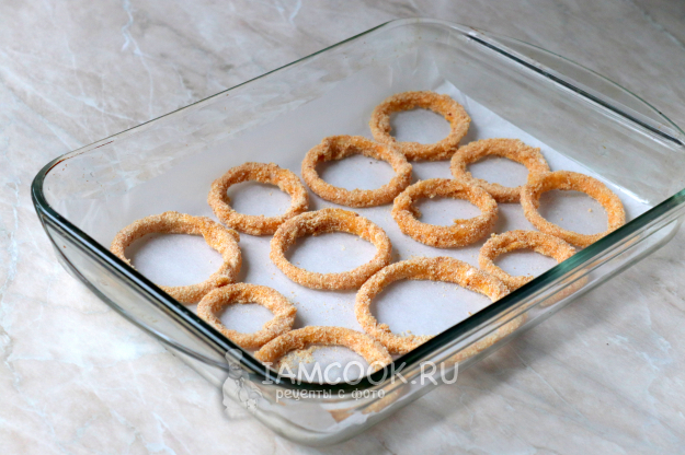 Выложите колечки на противень/жаропрочную форму, застеленный пергаментом.