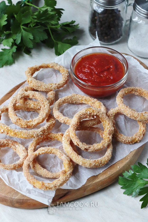 Выпекайте луковые кольца в духовке, разогретой до 180 градусов, 10 минут, затем аккуратно переверните каждое колечко и готовьте ещё в течение 10 минут, до появления румяной корочки.
