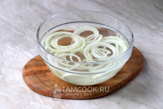 Крупную головку репчатого лука очистите и нарежьте ровными кольцами. Выложите их в глубокую миску и залейте доверху холодной водой. Оставьте на 30 минут. За это время уйдёт присущая луку горечь. Откиньте кольца на дуршлаг, чтобы стекла лишняя жидкость.