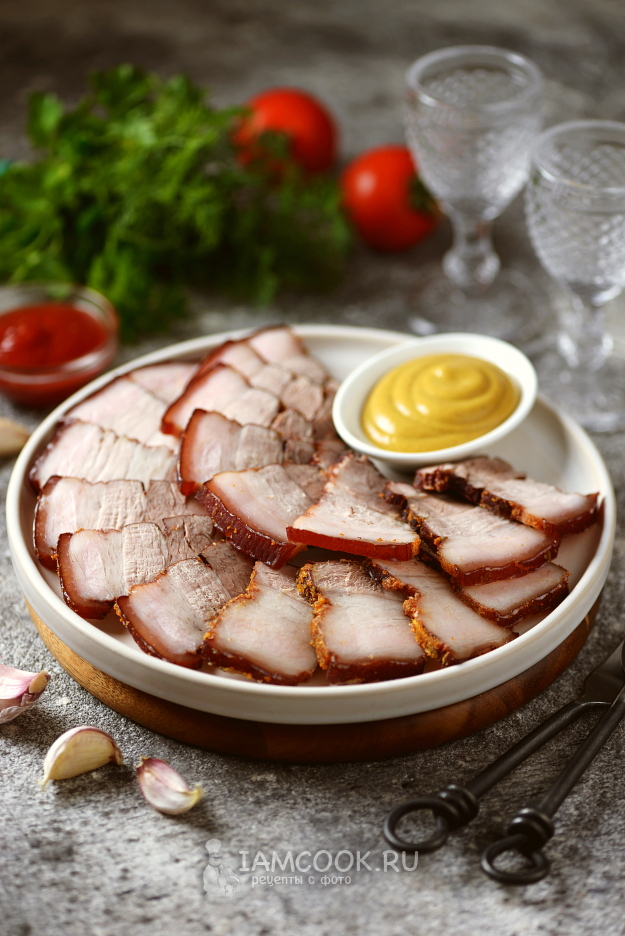 Спустя указанное время сваренный в луковой шелухе подчеревок с чесноком можно нарезать и подавать к столу со свежими овощами и горчицей.