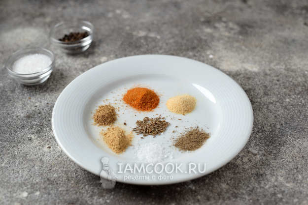 Подготовьте все специи по списку. Если в составе приправы для мяса есть соль, тогда ее можно не добавлять. При желании можно заменить всё на специальную приправу для сала. Чеснок можно взять свежий, измельчить, смешать со специями, но хранить такой подчеревок в холодильнике будет проблематично даже в герметичной посуде, поскольку запах будет слишком ядреный.