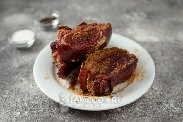 Смешайте все специи, обваляйте в них горячие куски подчеревка, чеснок набухнет и отдаст свинине свой аромат. Когда все остынет, переместите в холодильник на несколько часов.