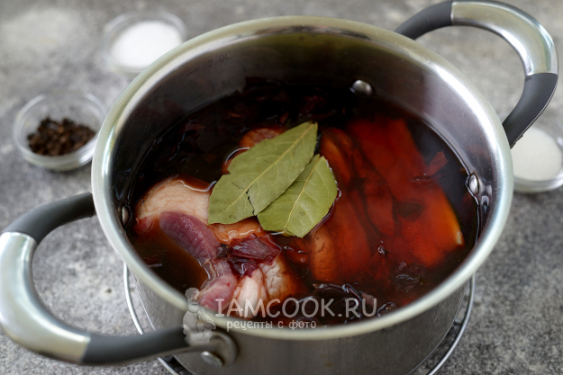 Выложите свинину в рассол, всыпьте перец горошком и лавровый лист, варите минут 40-50, зависит от толщины кусков.