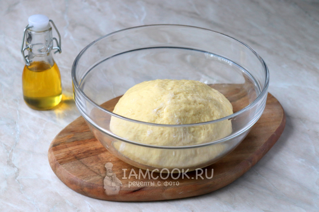 Густое тесто переложите на стол и замесите руками до гладкого состояния. Затем округлите его и выложите в миску, смазанную тонким слоем растительного масла. Накройте полотенцем и оставьте в тёплом месте на 1-1,5 часа для подхода.