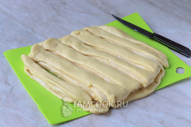 Выложите лепёшки на разделочную доску и разрежьте на произвольные полосы (как на фото).