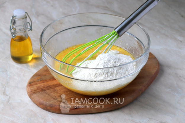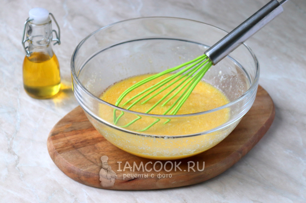 После чего вбейте куриное яйцо, добавьте щепотку соли и растительное масло. Тщательно перемешайте до однородности.