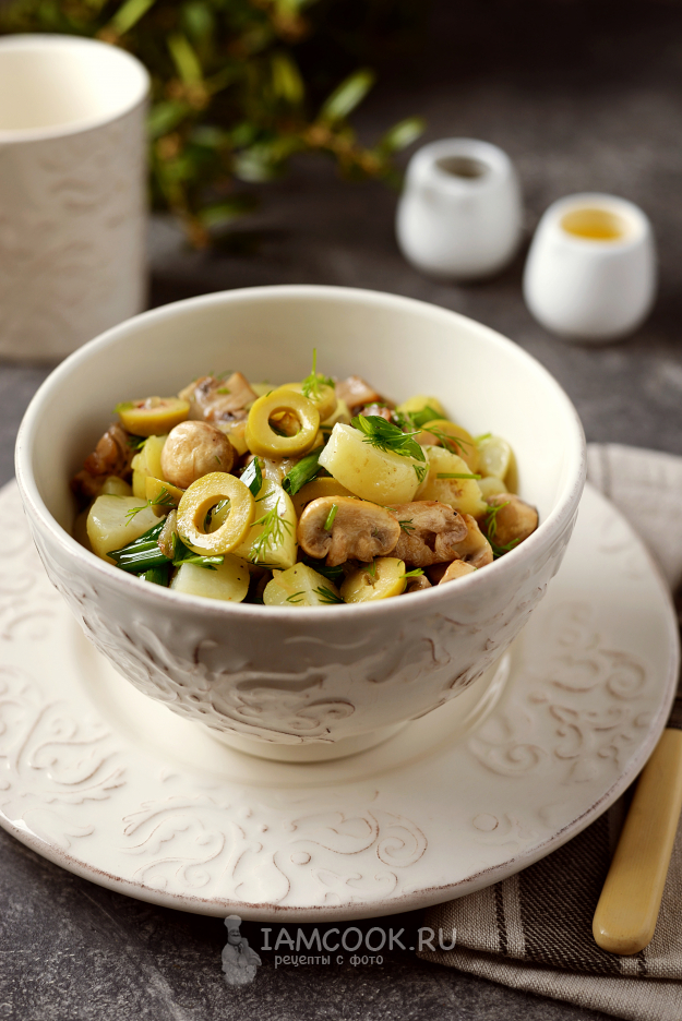 Постный салат с картофелем и грибами готов. Разложите по порциям и сразу же подавайте к столу.