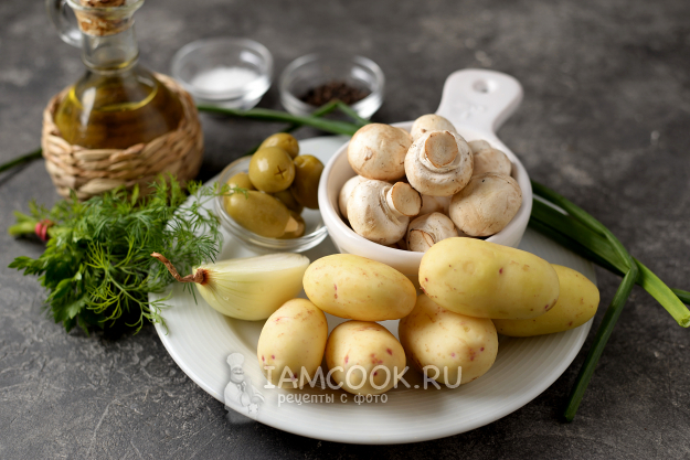 Подготовьте необходимые продукты для постного салата с картофелем и грибами. Если картофель старый, тогда почистите его, если же молодой, то помойте кожуру под проточной водой жесткой кухонной губкой. Лук репчатый очистите, помойте вместе с зеленым луком и укропом.