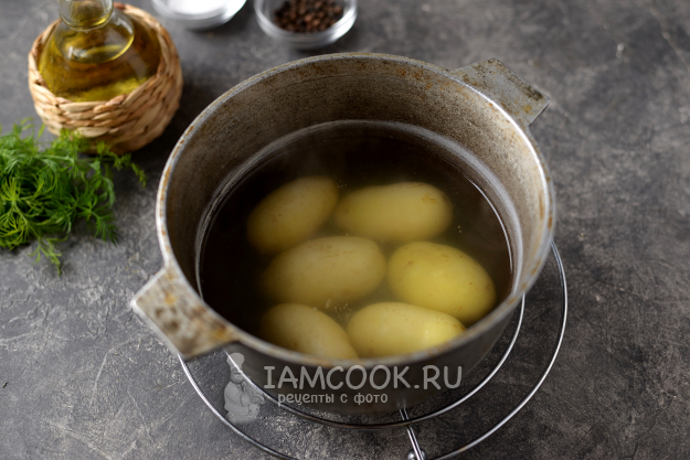 Молодой мелкий картофель отварите целиком в чуть подсоленной воде минут 12-15, старый картофель варите в кожуре до готовности, ее проверьте ножом. Слейте воду, картофель остудите.