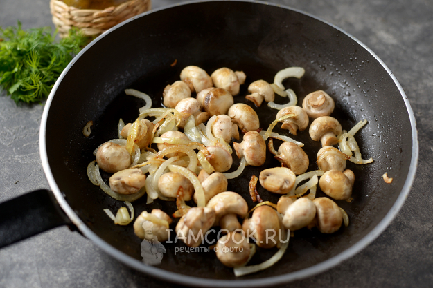 Разогрейте в сковороде немного постного рафинированного масла, обжарьте на тихом огне нарезанный репчатый лук и шампиньоны. Это всё также нужно остудить.