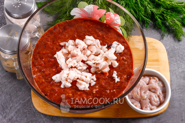 Извлеките сало из морозилки и нарежьте кубиками или мелкими кусочками, добавьте в емкость с печеночной массой.