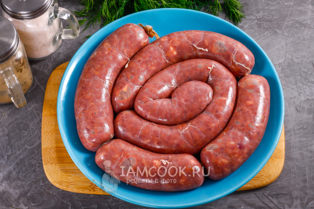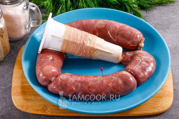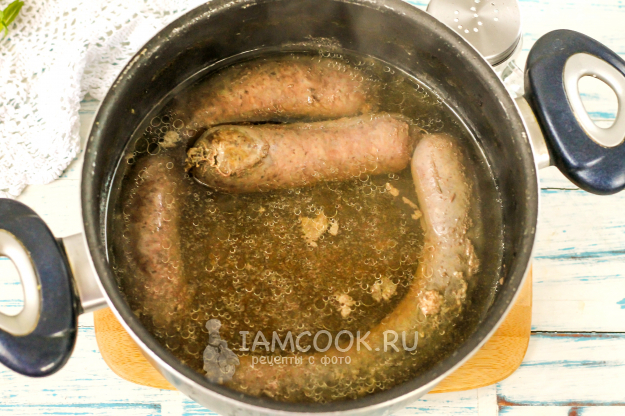 Поместите колбасу в кастрюлю и залейте холодной водой, доведите жидкость до кипения, убавьте нагрев до минимального и отварите колбасу примерно 40 минут до готовности, пробив ее иглой в нескольких местах, чтобы кишка не лопнула. Я варила колбасу на следующий день утром.