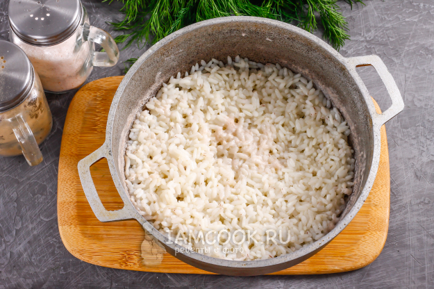Рис промойте несколько раз в воде, пока жидкость не станет прозрачной. Затем выложите его в казан и залейте 250 мл горячей воды, посолите и отварите в течение 12-15 минут практически до готовности, но не разваривайте. Остудите рис на холоде. Этот процесс можно сделать заранее, чтобы не ждать, пока каша остынет.