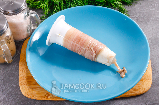 Таким образом начините всю кишку, но не плотно! Завяжите ее край и выложите на тарелку. Прикройте пищевой пленкой и поместите в холодильник на 4-6 часов, чтобы фарш внутри уселся. После извлеките и пробейте иголкой воздушные пазы. В таком виде вы можете ее заморозить в морозильной камере.