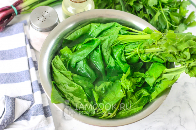 Промойте лебеду в воде. В чайнике или кастрюле вскипятите воду. Выложите пучок лебеды в глубокую емкость и залейте кипятком, оставьте на 1-2 минуты, затем горячую жидкость слейте, а зелень обсушите с помощью бумажных полотенец, иначе в салате будет слишком много жидкости.