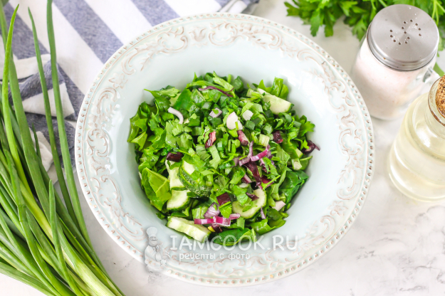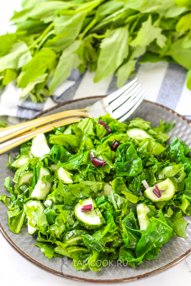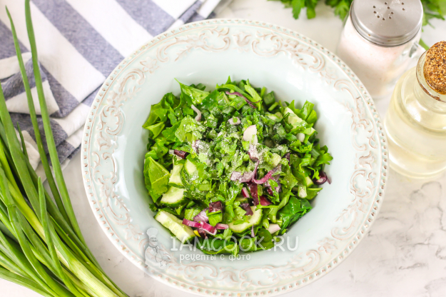 Выложите приготовленный зеленый салат из лебеды на тарелку и сразу же подайте к столу, пока в нем сохраняется максимум витаминов и микроэлементов.