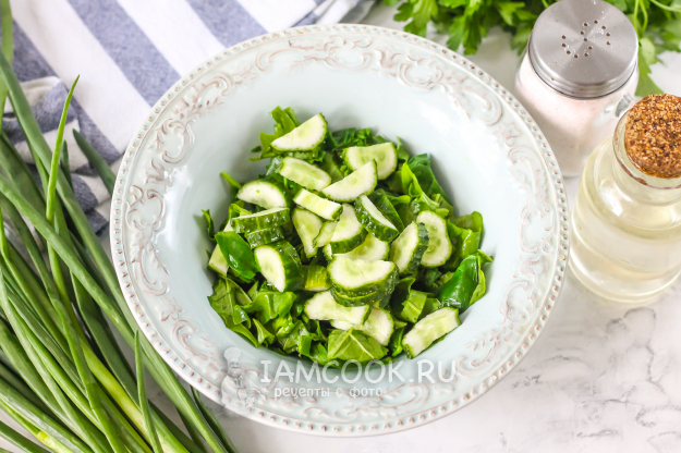 Промойте свежие огурцы в воде от грязи, шипов, срежьте хвостики с обеих сторон плодов. Разрежьте каждый из них пополам и нарежьте полукольцами, добавляя в емкость к лебеде. Много огурцов не добавляйте.