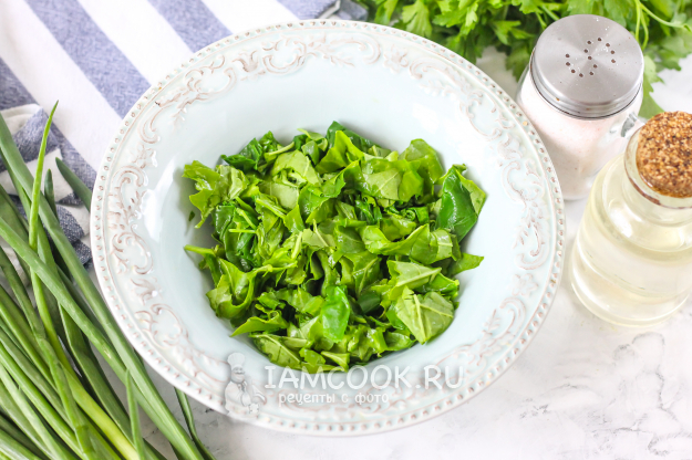 Обсушенную пропаренную лебеду нарежьте на части: крупно или мелко - решать вам. Выложите нарезку в миску или глубокую тарелку.