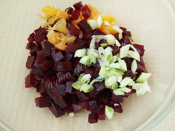 Аккуратно смешать в миске свеклу,нарезанный лук и апельсин.
