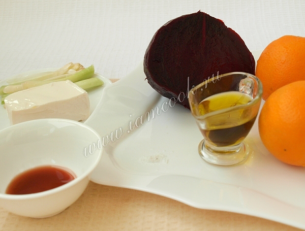 Для приготовления этого салата нам понадобится варёная свекла, апельсин, оливковое масло, винный уксус, лук, фета и соль по желанию.