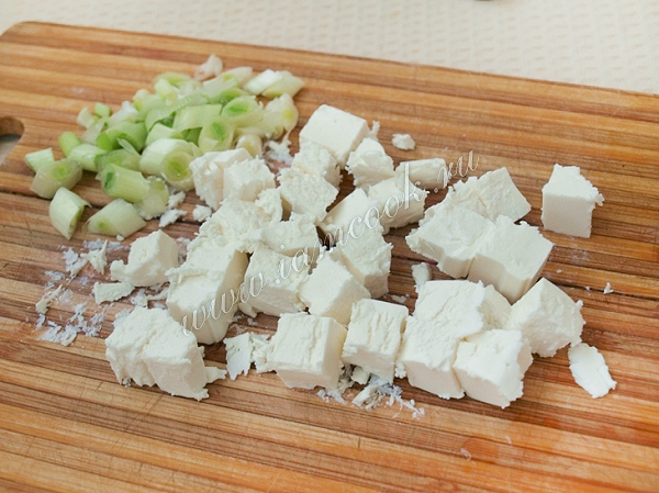 Нарезать кубиками сыр фета, мелко зелёный лук, используя только белую часть. Можно заменить на белую часть лука-порея.
