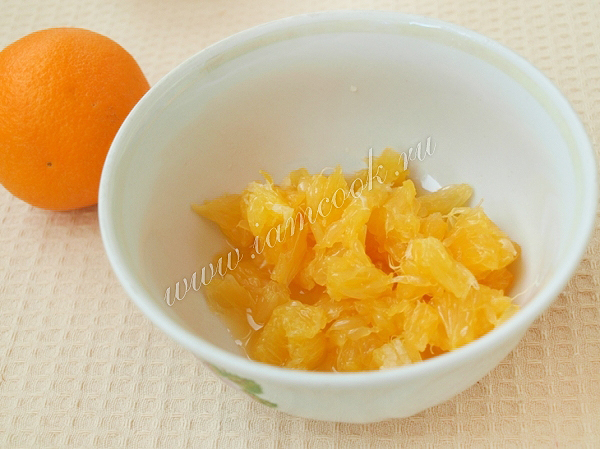 Апельсин разделить на дольки, снять плёнку и поломать руками на кусочки.