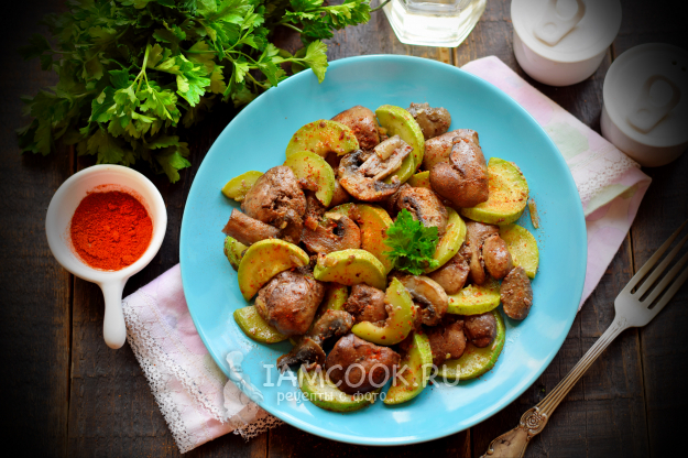 После остывания подайте куриную печень с грибами и кабачками на стол.