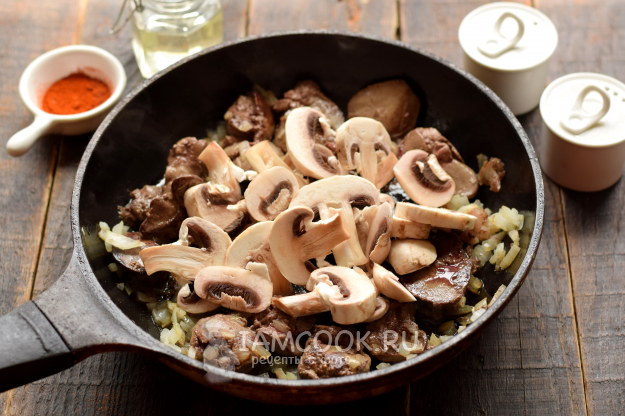 Шампиньоны тщательно вымойте, нарежьте крупными пластинками, закиньте в сковороду к печени. Огонь уменьшите, грибы посолите, сковороду прикройте крышкой, чтобы шампиньоны пустили сок.