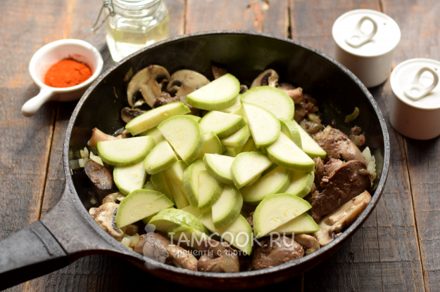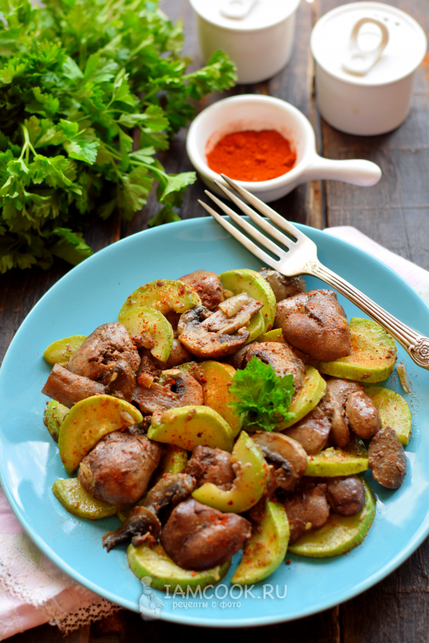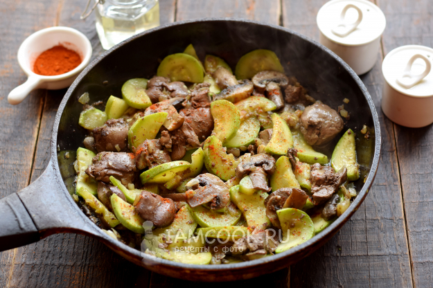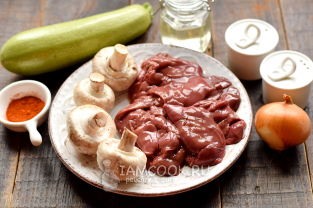 Ингредиенты для приготовления куриной печени с грибами и кабачками в сковороде - перед вами.