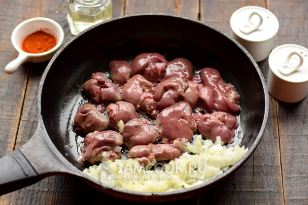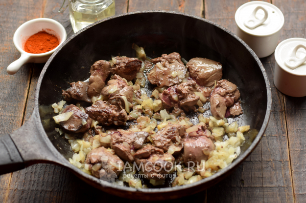 Жарьте печень на сильном огне по 2 минуты с каждой стороны, затем перемешайте ее с луком, только после этого посолите.
