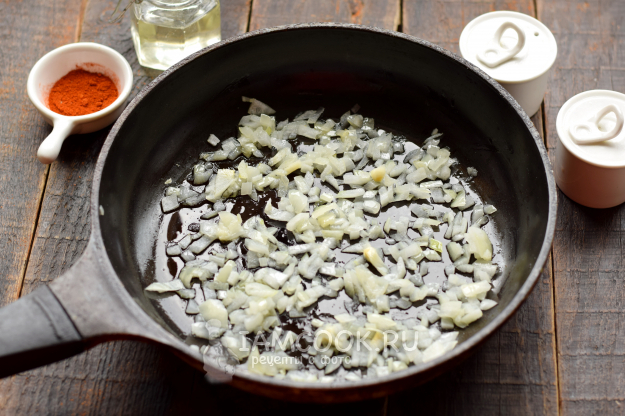 Головку лука очистите, нарежьте кубиком. Сковороду нагрейте, влейте 1 ст.л. масла, закиньте нарезку лука. Пассеруйте лук на небольшом огне 2 минуты - до полупрозрачности.