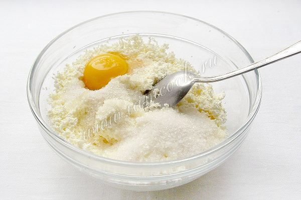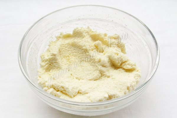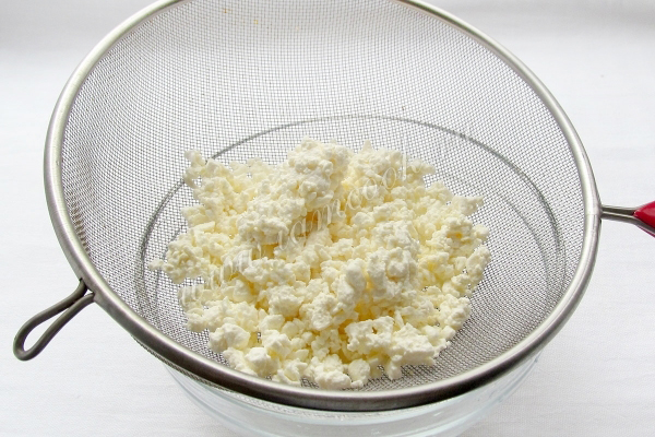 Тем временем приготовим начинку. Творог нужно протереть через сито, чтобы крупинки не мешали равномерно распределяться.
