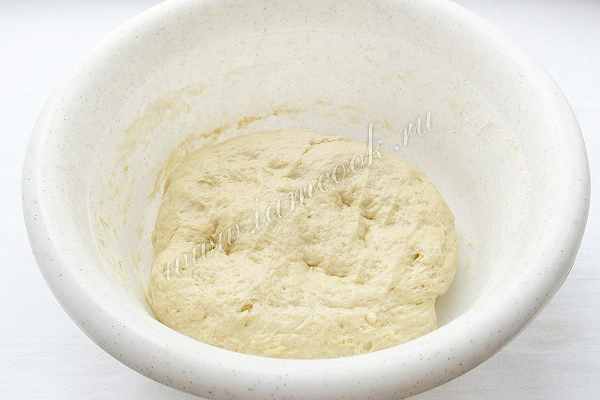 Замесить мягкое тесто, муку подсыпать постепенно. Оно прекрасно замешивается за счет оливкового масла и совсем не липнет к рукам. Накрыть тесто полотенцем, поставить в теплое место и дать хорошо подняться. На это уйдет около часа.