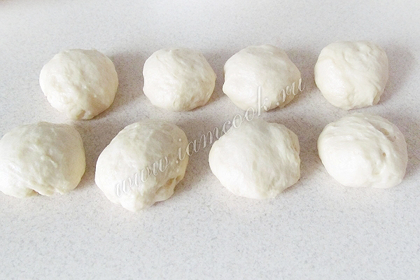 Подошедшее тесто разделить на равные кусочки, примерно по 45-50 грамм. Скатать шарики и дать немного полежать.