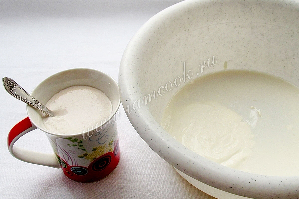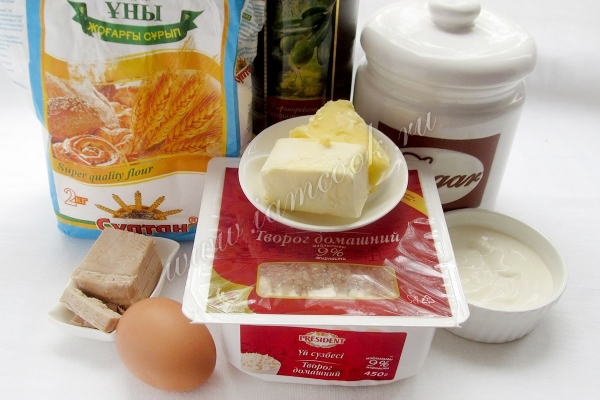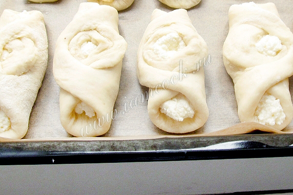 Дрожжи развести в теплом молоке, добавив ложечку сахара. Они поднимаются "шапочкой" через пару минут . Добавить их в теплое молоко и всыпать все остальные составляющие для теста. Сахар можно регулировать по своему вкусу, нам нравится сладкое тесто с творогом.