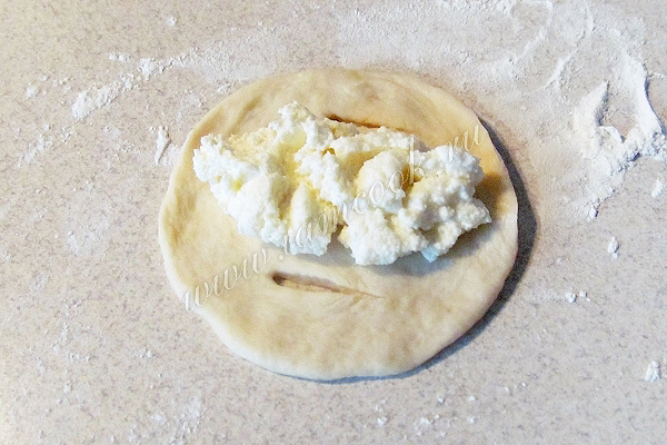 Каждый шарик расплющить в лепешку и выложить начинку. Можно сделать закрытые пирожки, тогда достаточно залепить пирожок , как вареник. Но в с творогом не рекомендуется печь закрытые пирожки, внутри может отделяться жидкость. Мы сделаем ватрушки, прорезав ножом маленькие щелки по краям теста.