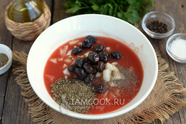 Томаты вместе с соком переложите в глубокую тарелку, добавьте крупно нарезанный репчатый лук, оставшиеся прованские травы, соль и перец по вкусу, а также маслины. При желании можно удалить косточки, но я оставила их целиком. Также я всыпала щепоть сахара, чтобы сбалансировать вкус будущей подливы.