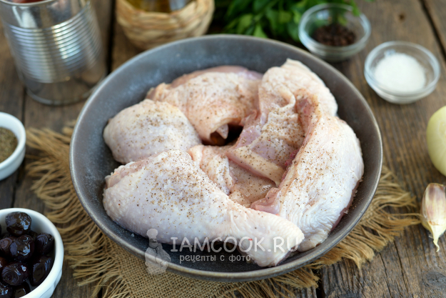 Курицу помойте, обсушите слегка, нарежьте крупными кусками, сложите в глубокую миску, всыпьте соль и перец по вкусу.